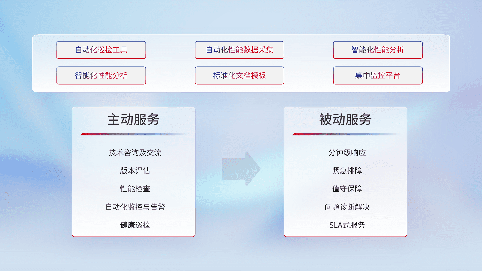 智能化工具和标准化文档,,,保障服务质量,,,提供主动服务(包含技术咨询、、、版本评估、、性能检查、、、自动化监控与告警、、健康巡检)和被动服务包含(分钟级响应、、、、紧急排障、、值守保障、、问题诊断解决、、、、SLA服务)。。
