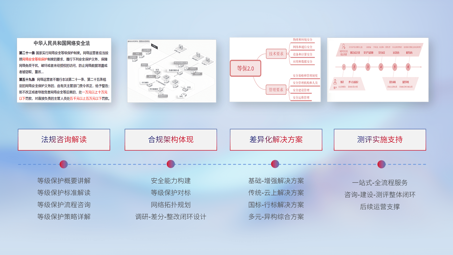 通过专业的法律咨询解读、、合规架构体现、、、差异化解决方案、、测试实施支持等服务,,,为客户量身打造等保合规体系。。。。